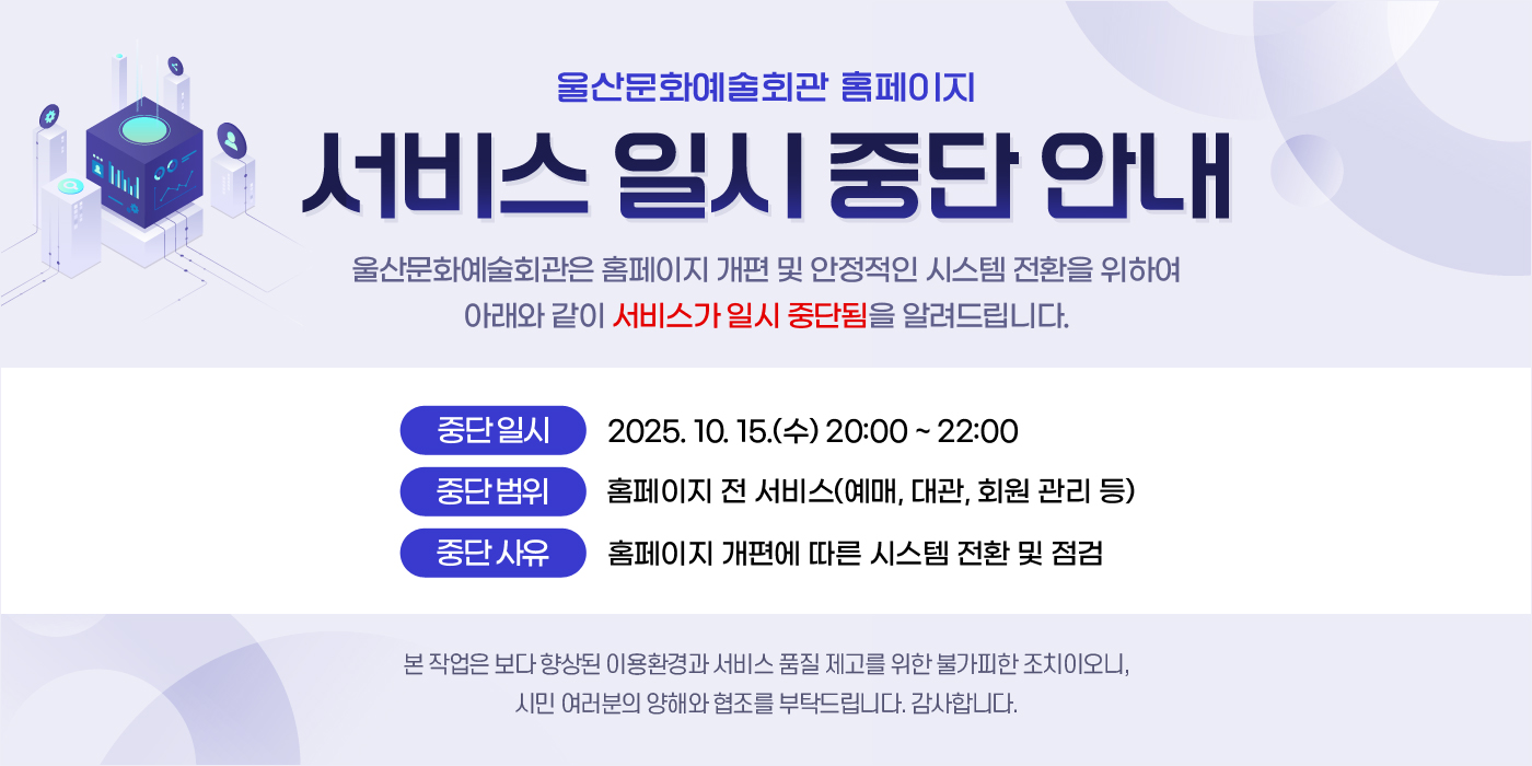 더욱 다양한 더욱 풍요로운 대관공연 기타 대관공연 2025 예술한마당(2회차) 상세 음악회 대관공연 제12회 아마빌리스 정기연주회 상세 음악회 대관공연 클래식여행스케치 <파리찍고 제주까지> 상세 음악회 대관공연 제14회 한사랑silver합창단 정기연주회 상세 음악회 대관공연 제14회 울산태화강합창단 정기연주회 상세 클래식 대관공연 디즈니+지브리 오케스트라 콘서트 상세 클래식 대관공연 울산광역시 남구 구립교향악단 제105회 정기연주회 상세 음악회 대관공연 차오름 청소년 예술단 연합 연주회 상세 음악회 대관공연 2025 '별이 쏟아지는 밤' 음악회 상세 무용 대관공연 김외섭무용단 암각의 빛 상세 음악회 대관공연 제11회 울산시민대화합음악회 상세 클래식 대관공연 변유진 네번째 첼로 독주회 상세 국악 대관공연 처용국악관현악단 제22회 정기연주회 상세 기타 대관공연 2025 예술한마당(3회차) 상세 클래식 대관공연 울산윈드오케스트라 제26회 정기연주회 상세 클래식 대관공연 2025 더에임 챔버오케스트라 정기연주회 상세 음악회 대관공연 2025 울산 남구 소년소녀합창단 제14회 정기연주회 상세 콘서트 대관공연 최백호 전국투어 콘서트 <낭만에 대하여> - 울산 상세 클래식 대관공연 제16회 오퍼스원오케스트라 정기연주회 상세 음악회 대관공연 제4회 문화원과 함께하는 가을문화한마당 상세 클래식 대관공연 울산챔버오케스트라 제23회 정기연주회 상세 기타 대관공연 2025 전국 색소폰 대회 상세 음악회 대관공연 제10회 울산레이디싱어즈 정기연주회 상세 클래식 대관공연 제6회 울산오케스트라 정기연주회 상세 클래식 대관공연 제15회 SMI청소년오케스트라 정기연주회 상세 기타 대관공연 조선 최초의 전문 외교관 울산 학성이씨 시조 '이예'선생 상세 어린이 대관공연 뽀로로 가족 뮤지컬 뽀로로 포털의 세계 상세 이전 다음 재생 정지 더보기